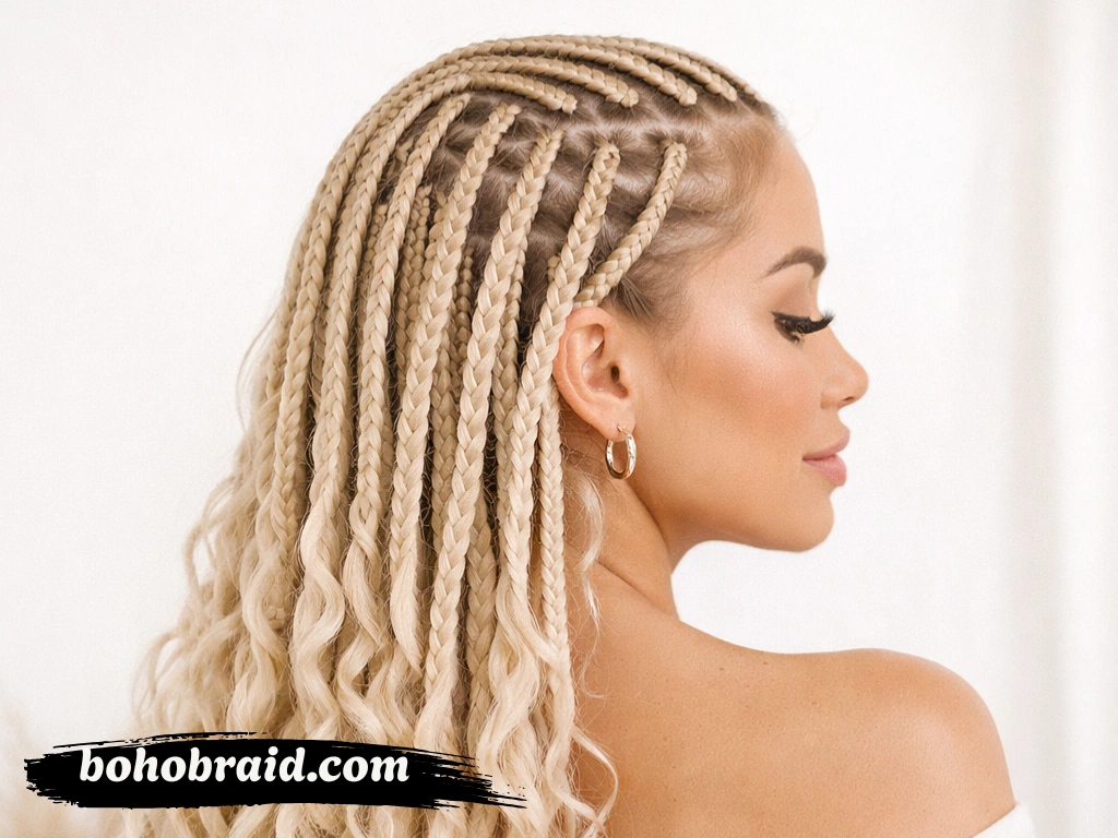 This creates a flatter, lighter, and more natural look. The “boho” effect comes from the curly pieces that are left out, giving the hairstyle softness and movement. When done in blonde shades, the braids appear brighter, trendier, and more dimensional.